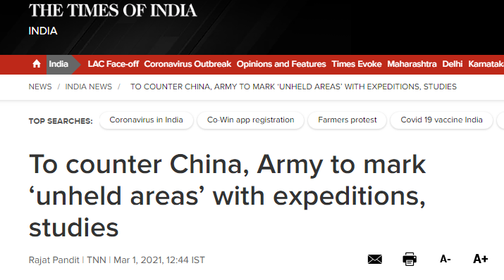 “為對抗中國,陸軍用探險、研究的方式來標記‘未控制地區’,”3月1日,《印度時報》這標題一出,外界都清楚其口中的陸軍是印度陸軍。這篇報道說,印度陸軍正堅定地推動以登山探險和研究的方式,宣傳和鞏固印度在北部邊境地區的所謂“合法領土主張”,而中國被描繪成善用“切香腸”策略的對方。 報道援引一名印度高級官員的話宣稱,中國公然擴張領土的政策需要得到有效反制,“陸軍向北部邊境增派兵力和火力來加以平衡的同時,通過登山和其他...