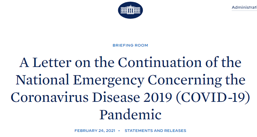 據美國有線電視新聞網(CNN)報道,當地時間24日,白宮正式表示,將繼續執行上一屆政府因新冠肺炎疫情而宣布進入的“國家緊急狀態”。 在24日發布的新聞稿中,白宮稱新冠疫情繼續對美國的公共健康和安全造成重大風險,並提到在2021年3月1日後,“國家緊急狀態”仍將繼續實施。當地時間2020年3月13日,美國前總統特朗普宣布“國家緊急狀態”,以應對美國新冠肺炎疫情。