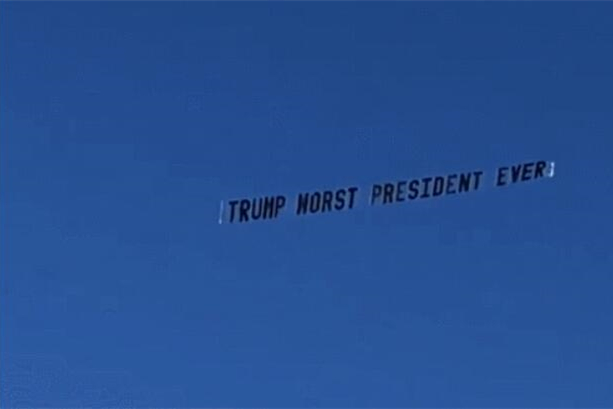 “史上最差的總統!(Trump the worst president ever)”24日,特朗普居住的佛羅里達州海湖莊園附近,天空中飄來了這樣幾個字....。。 這一幕被目擊者拍下並上傳至社交媒體。現場視頻顯示,有飛機拖著長長的條幅在空中飛過,內容直指特朗普。另一條橫幅上則寫著,“特朗普,妳這個可悲的失敗者,滾回莫斯科去!(Trump you pathetic loser go back to Moscow)...