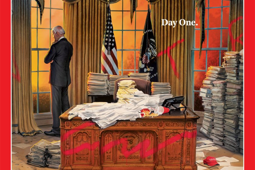 紙撒了一地,淩亂的文件堆積在案頭、椅子、地板,桌上還留著吃剩的薯條和空可樂杯,更不要說地上的小紅帽和窗簾上的“T R”塗鴉……美國《時代》周刊21日新發布的2月1日刊封面,到位地詮釋了什麽叫“爛攤子”。 美國,在我“手上”了,今後的路,怎麽走?酷似拜登的白發老人,在“一地雞毛”中對著窗外沈思。 《時代》周刊2月1日封面,圖名:第一天(Day One) 有意思的是,《時代》在推特上發布的封面是動態圖。...