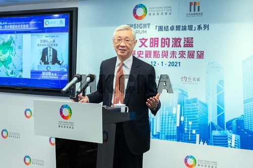 1月12日,團結香港基金(基金會)舉辦第十三場“團結卓爾論壇”,香港城市大學榮休校長張信剛教授以“文明的激盪—歷史觀點與未來展望”為題發表演講。張教授以其睿智眼光,回顧人類文明的發展,指出人類本同源,天下本為公。他認為和諧共處、國際合作、文明互補是人類在地球上創造美好新世界的必要條件。 香港中通社圖片