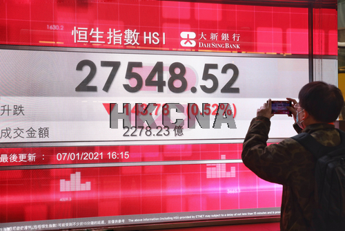 1月7日,截至收盤,香港恒生指數跌143.78點,跌幅0.52%,報27548.52點,主板全天成交2278.23億港元。(香港中通社記者 謝光磊 攝) 香港中通社圖片 [1] [2] [3] [下一页]