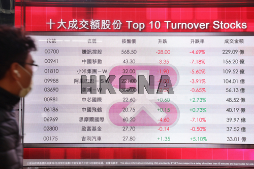 1月7日,截至收盤,香港港股指數全線收跌,恒生科技指數大跌2.42%,大型科技股重挫。騰訊控股跌4.69%,報568.5港元;阿里巴巴跌3.91%,報221港元。(香港中通社記者 謝光磊 攝) 香港中通社圖片
