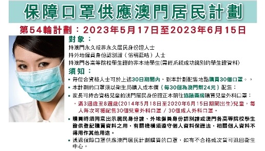 新型冠狀病毒感染應變協調中心公佈,第54輪保障口罩供應澳門居民計劃於5月17日開始。