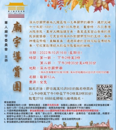華人廟宇委員會公布,將於10月16日舉辦深水埗關帝廟導賞團,由即日起至下周日(9日)接受報名。